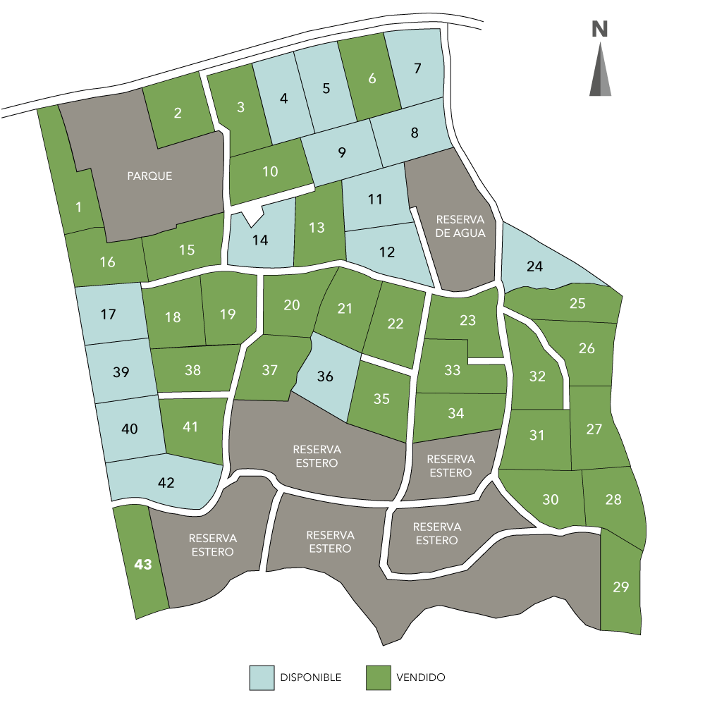 El proyecto cuenta con un total de 43 parcelas en venta. Cada uno de los sitios solo tendrá un uso residencial, de esta forma garantizamos la paz y tranquilidad a cada uno de los residentes al interior del condominio.